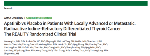 2021年12月16日,权威医学杂志《JAMA Oncology》(影响因子31.777)在线发表阿帕替尼的一项III期临床研究(REALITY)——甲磺酸阿帕替尼片治疗局部进展/转移性放射性碘难治性分化型甲状腺癌(RAIR-DTC)患者的多中心、随机、双盲、安慰剂对照临床研究。此研究由北京协和医院的林岩松教授和南京金陵医院的秦叔逵教授发起,在全国21个研究中心展开,由博天堂918医药中央医学事务部团队支持完成。
