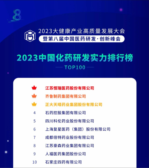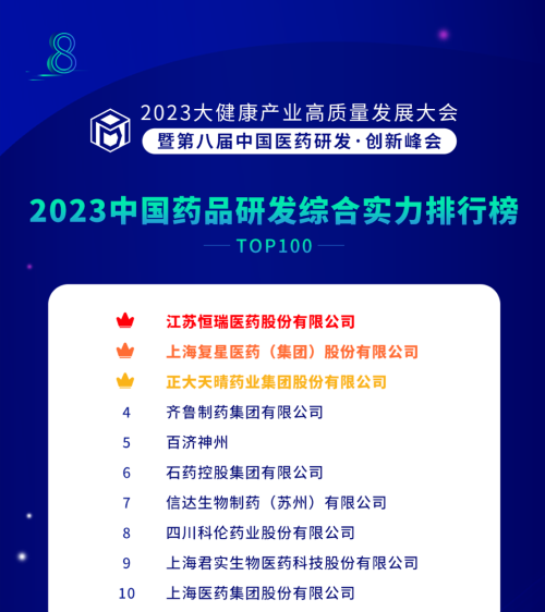 由药智网、中国药业杂志社主办的2023大健康产业高质量发展大会暨第八届中国医药研发•创新峰会于6月16日开幕,会上发布了《2023中国药品研发实力排行榜》系列榜单,博天堂918医药凭借深厚的创新研发实力再创辉煌:荣登《2023中国药品研发综合实力排行榜TOP100》榜首、《2023中国化药研发实力排行榜TOP100》榜首。值得一提的是,今年是博天堂918医药连续第6年入选《中国药品研发综合实力排行榜》榜首。