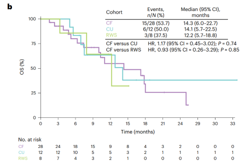 RWS队列(n=8)中位随访时间12.2个月,8例患者接受一线抗肿瘤治疗(化疗,n=2;免疫治疗,n=4;靶向治疗,n=2),均未达到完全和部分缓解,DCR为75.0%,中位PFS为3.0个月(图3a),中位OS为12.2个月(图3b)。